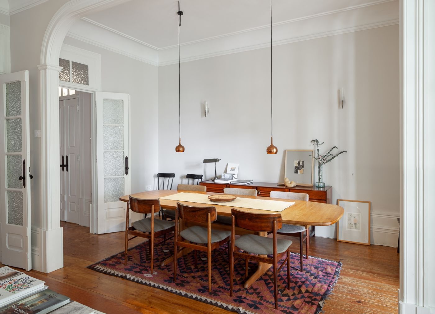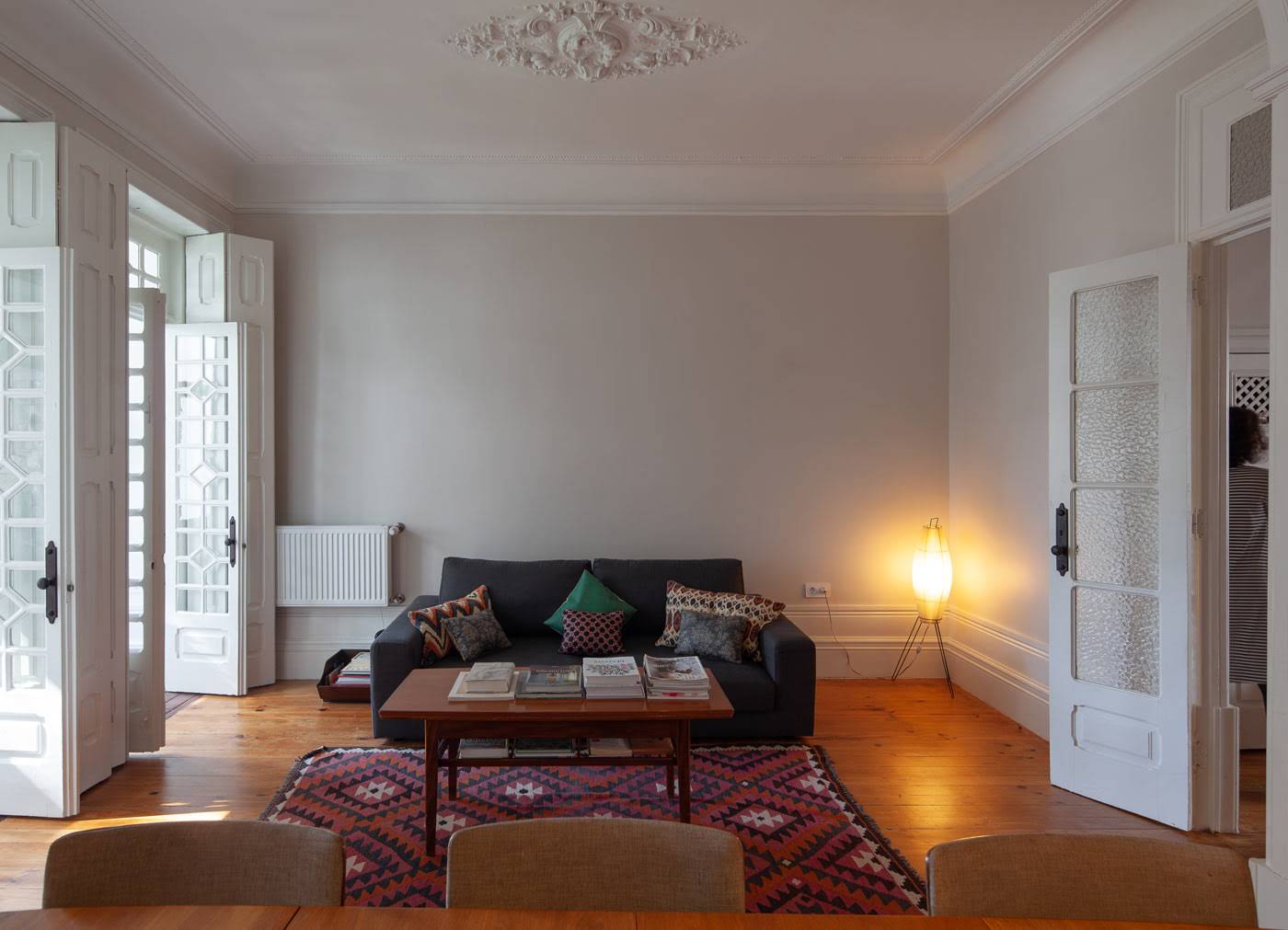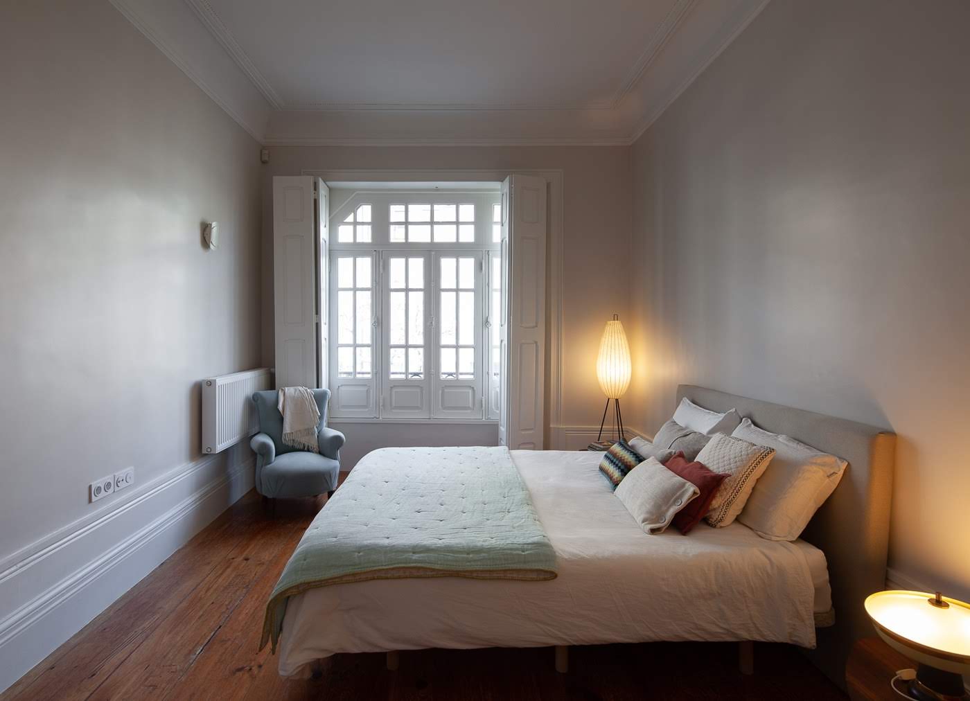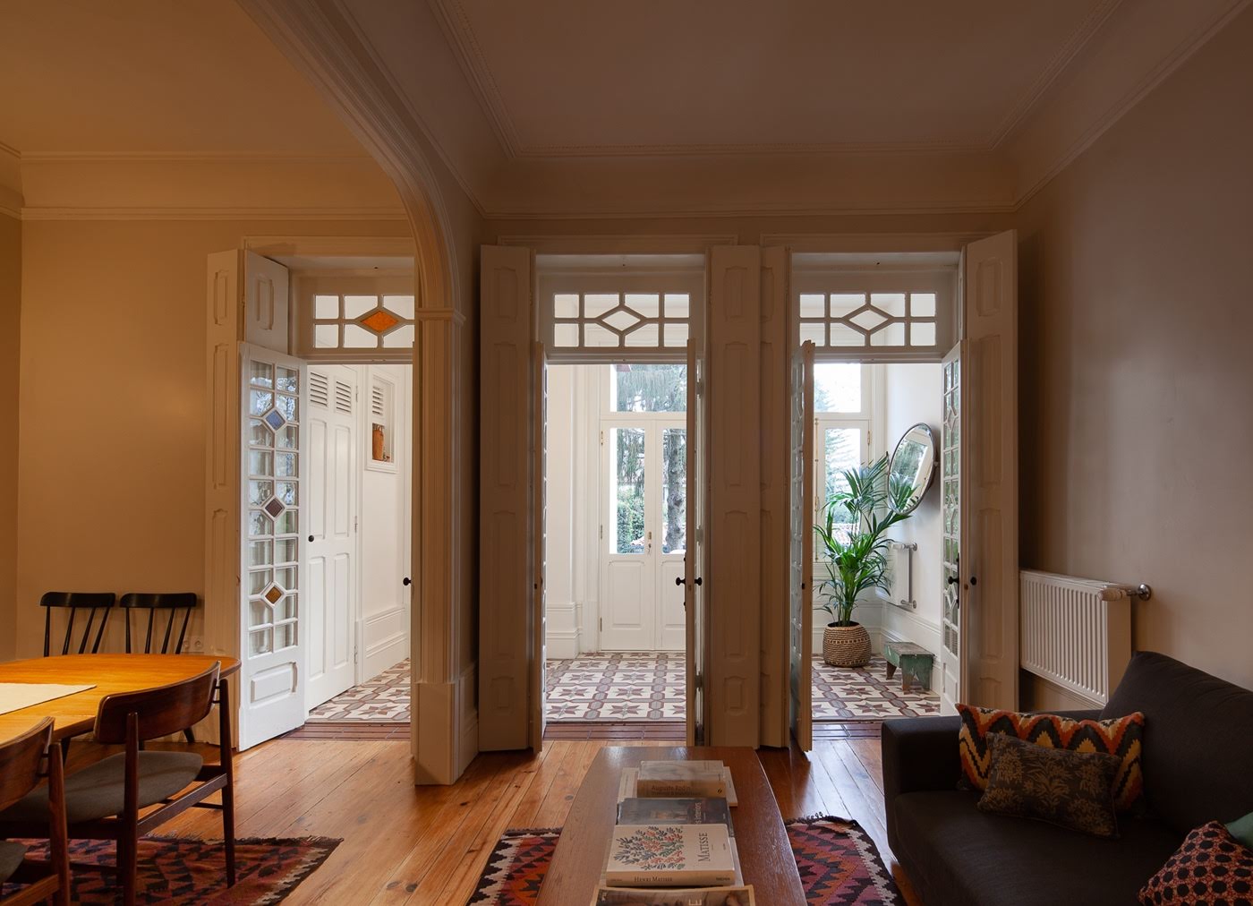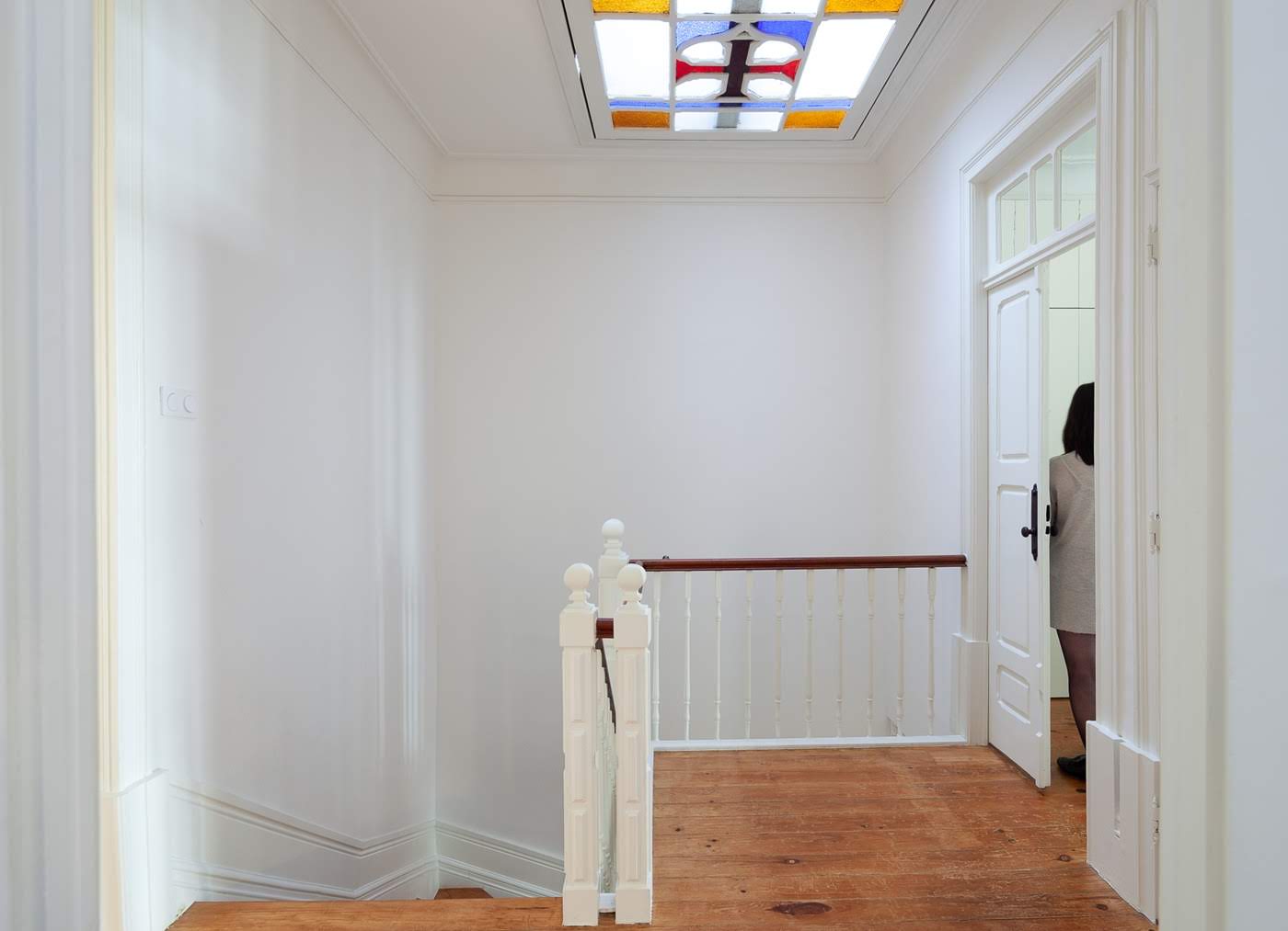Nos dois pisos superiores, piso térreo e 1º piso, que mantiveram o uso original, salas e quartos, respectivamente, a intervenção foi pontual, decorrente de necessidades específicas, optando-se pela preservação de tectos, soalhos e carpintarias interiores. Nas instalações sanitárias e na cozinha procurou-se adoptar materiais de revestimento compatíveis com os existentes, como a marmorite, de forma a manter alguma continuidade entre os espaços.